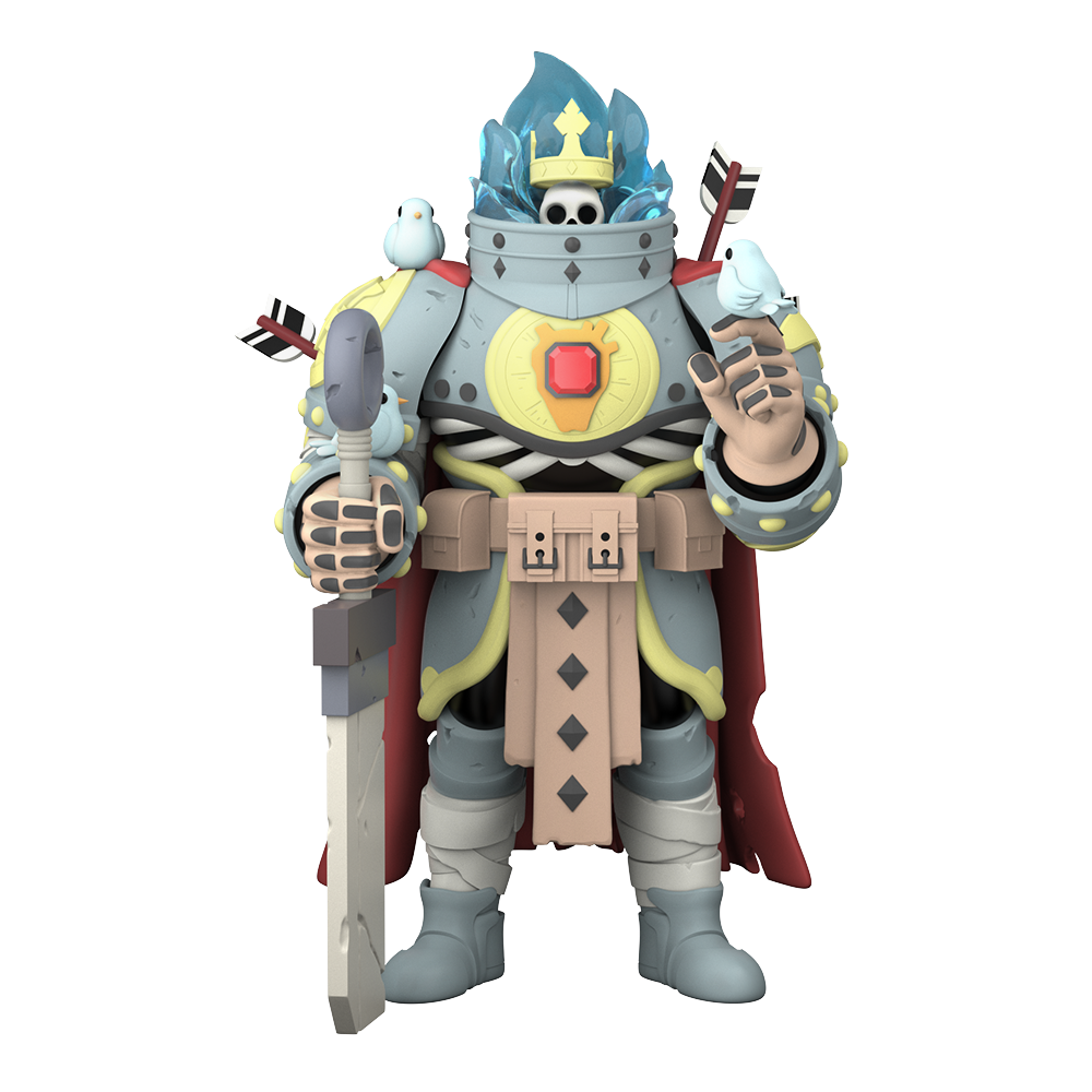 Mighty Jaxx brings this exciting world to life with Birdking by CROM. The guardian spirit’s skull is encased in transparent blue flames. At the heart lies a precious, glossy red gem that holds a secret. Other notable features include the birds surrounding it, arrows embedded in his armor, and the blade in his hands—all carefully crafted with intricate detailing.