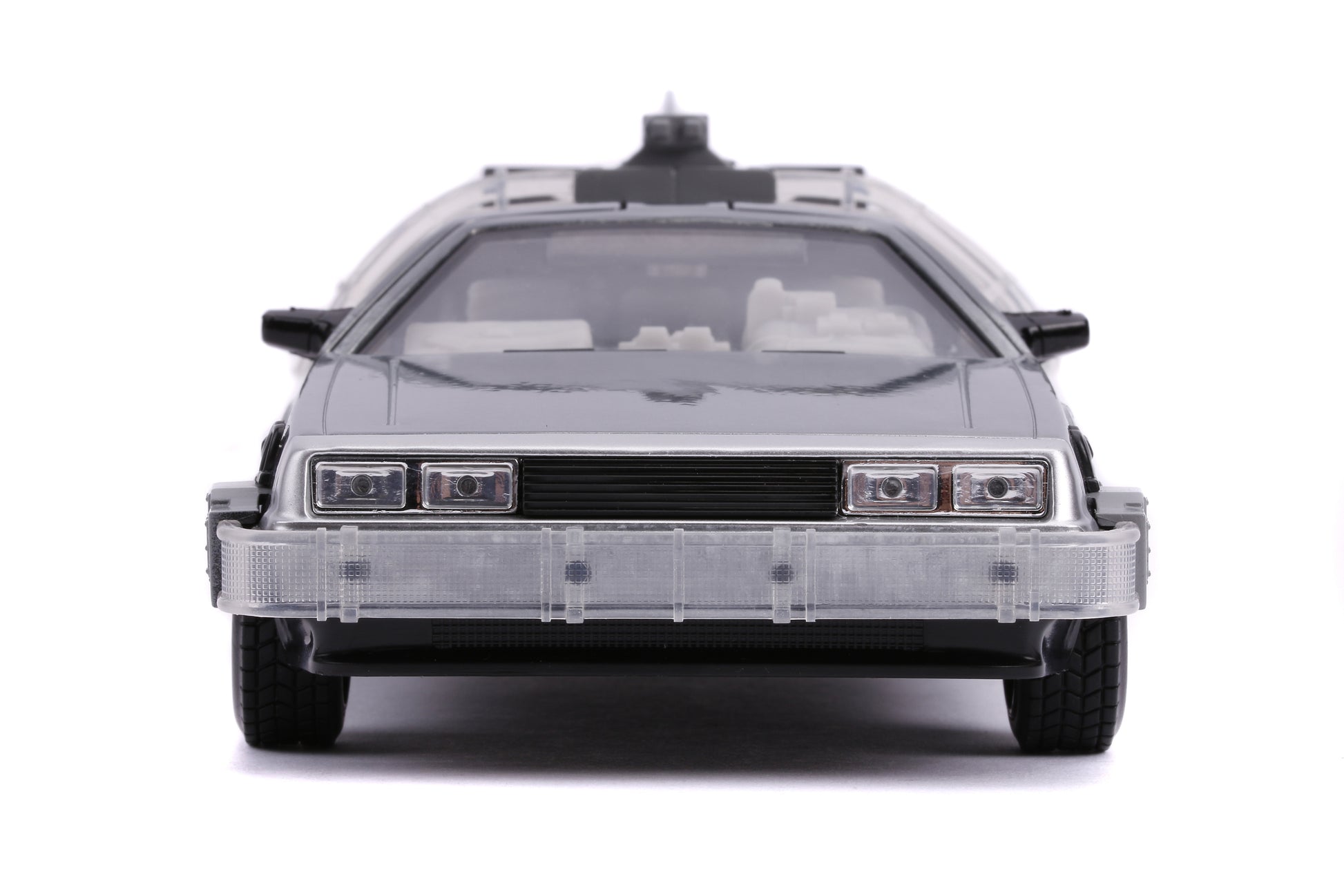 From Jada Toys. Travel back to the future with one of the most iconic vehicles in the Hollywood Rides lineup: the Time Machine as seen in Back to the Future Part II (1989). Featuring a die-cast body, rubber tires, opening doors, light-up feature and best of all you can fold the wheels inward and display the Time Machine in hover mode. This 1:24 scale vehicle is a must have in any collection!
