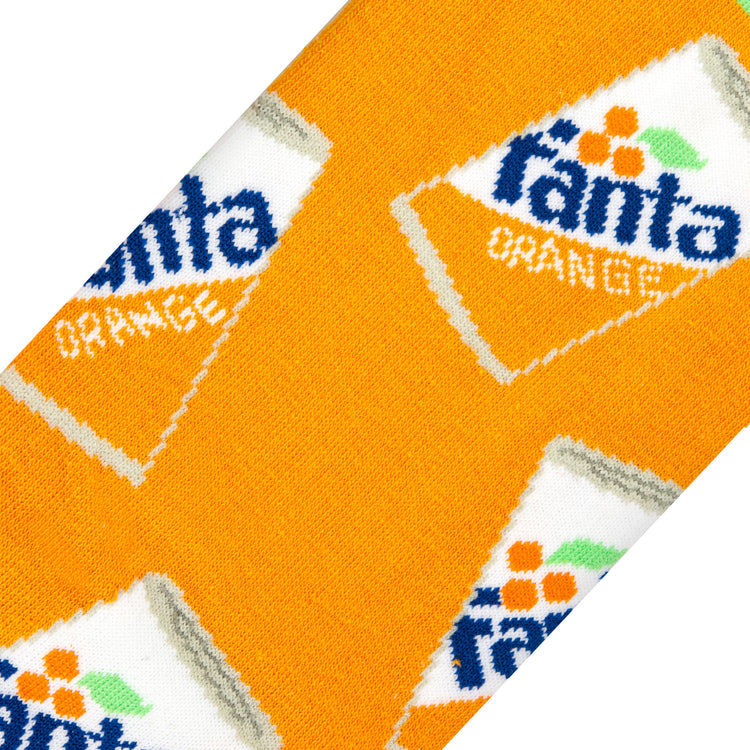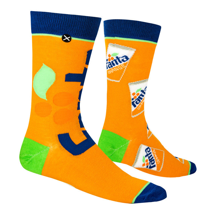 Add a little bubbly vibe to your sock game in these Fanta Orange Split crew socks from Odd Sox. These orange socks feature a split design with the blue Fanta logo in large print on one sock and graphic knitted images of Fanta soda cans all over on the other. The poly-cotton blend ensures a vibrant image with a padded toe and heel for extra cushioning. Each pair of socks is complete with a y-gore fitted heel and extended cuff to prevent sliding.
