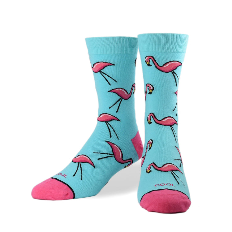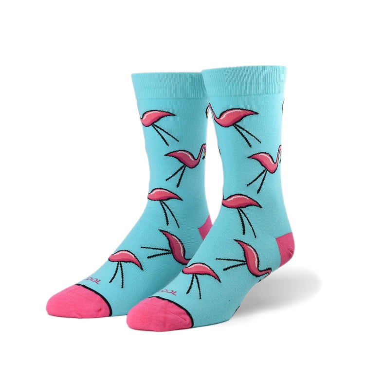 The tall bird that reminds you of paradise is now a fashion statement with these pink and blue flamingo crew socks. Whether you're standing on one foot or two the thickened toe and heel provide maximum comfort and cushion.
