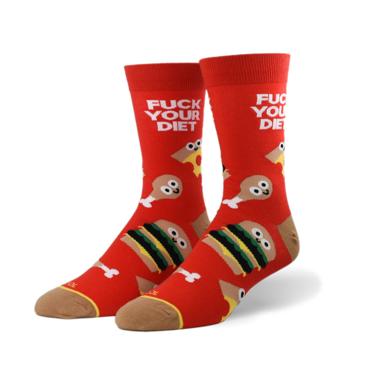 Forget the healthy stuff and satisfy your junk food craving in these delicious No Diet crew sock. The bright red socks feature all your favorite greasy foods like fried chicken, burgers and pizza. Munch in comfort and style, available in sizes 6-13.