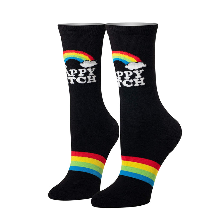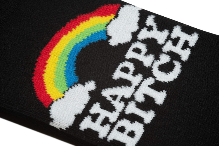 If everything is all sunshine and rainbows and you're one happy camper, then these "Happy Bitch" statement crew socks are a great way to let everyone know how you're feeling. These black crew socks feature colorful rainbow stripes. The extended cuff prevent sliding and the lightweight cotton material enhances breathability.