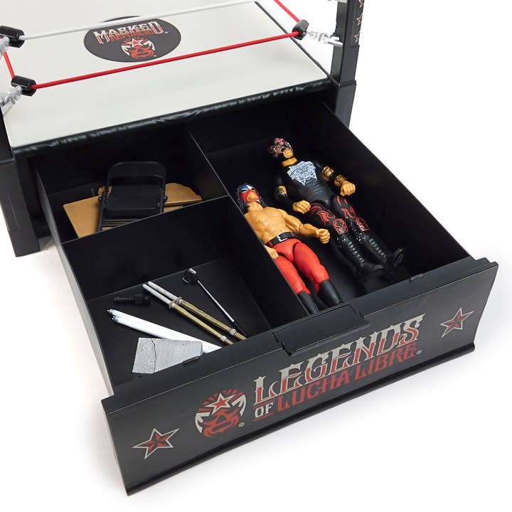 Bring the ringside action home! This 12x12 four sided standard ring has everything you need to bring the match to life, including elastic ropes, ring post foot pegs for real jump action, and storage drawer to help all your accessories and figures hide when the match is done. This ring is age graded 8+