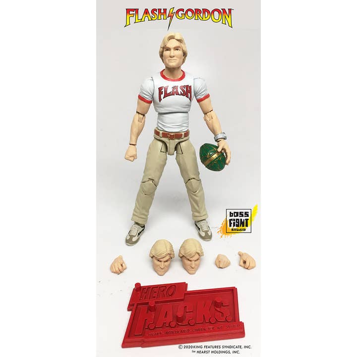 Boss Fight Studio’s first item celebrating the 40th anniversary of the 1980 Flash Gordon movie is here! A special, 1/18th scale Hero H.A.C.K.S. action figure of "The King of the Impossible” himself, Flash Gordon as portrayed by Sam J. Jones is here to save the universe! Flash is clad in his Earth clothes - a stylish ringer t-shirt with red FLASH logos, khaki pants, and sneakers. His accessories include two alternate heads with different expressions, as well as alternate fighting fists, a “football”-holding hand, the green egg-like improvised “football” used to take down Ming’s guards and a Hero HACKS logo stand. This special-edition figure comes packaged in a collectible metal lunchbox covered with a mix of classic movie poster art and brand new art created by artist, Erica Henderson! Includes: -Fully posable Flash Gordon 4” Figure -Six accessories -Figure Stand -Collectible metal lunchbox *These figures are adult collectibles for Ages 12 and up. Contains small parts.