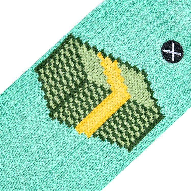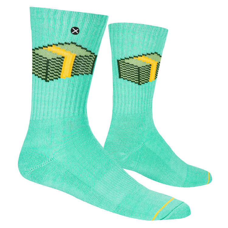 Show off your killer street style in these pixel money stacks crew socks. These turquoise crew socks feature a simple design with a pixelated stack of money at the cuff. The 100% premium cotton enhances comfortability and the double layered bottom maximizes cushioning.
