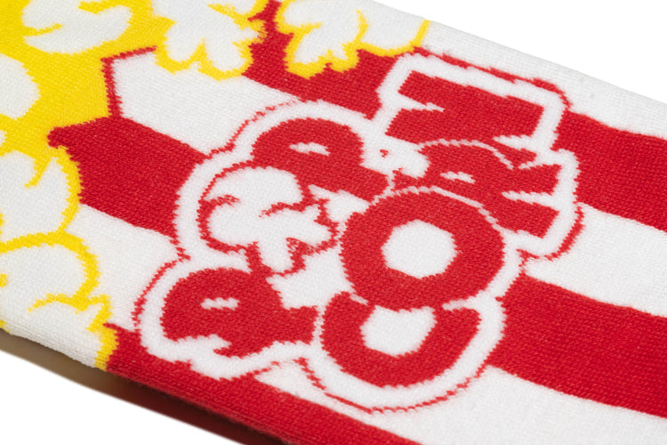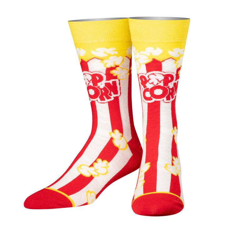 Play your favorite movie, grab your favorite snacks, and snack on these comfy Popcorn crew socks. These cotton knitted socks feature red and white stripes resembling a popcorn bucket, complete with buttery yellow popcorn kernels. Designed with a double layered cotton bottom for cushion and cotton tube ribbing for a flexible and snug fit.