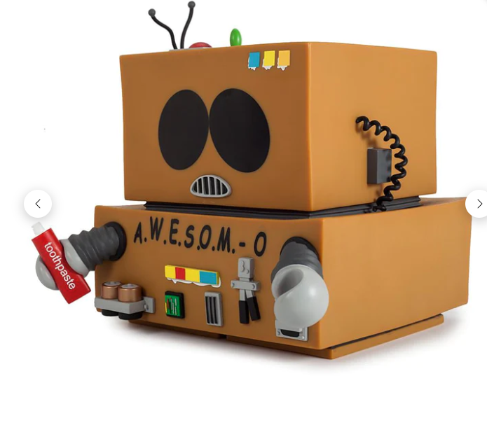 Technically known on South Park as A.W.E.S.O.M.-O 4000, hijinks ensue when Cartman does what Cartman does and acts like a choade. Disguising himself to learn Butters' deepest secrets, Kidrobot's medium AWESOM-O has a removable box-head revealing the half-starved face of Eric Cartman with only his toothpaste accessory for sustenance. You need to bring home this 6-inch tall fully-sculpted and articulated AWESOM-O figure before the military turns him into an AI-enabled weapon of mass dickification. This figure is larger than he looks!