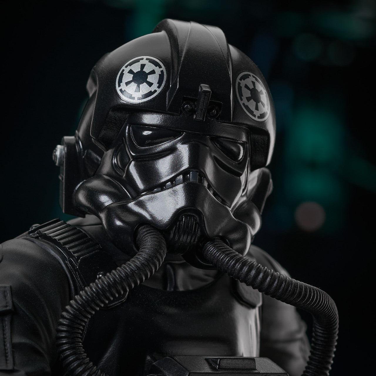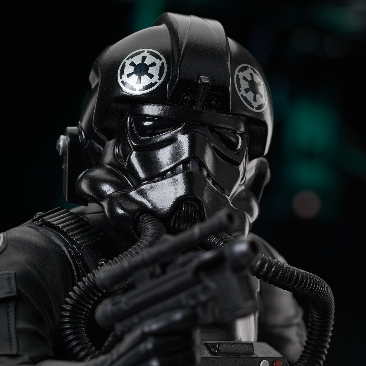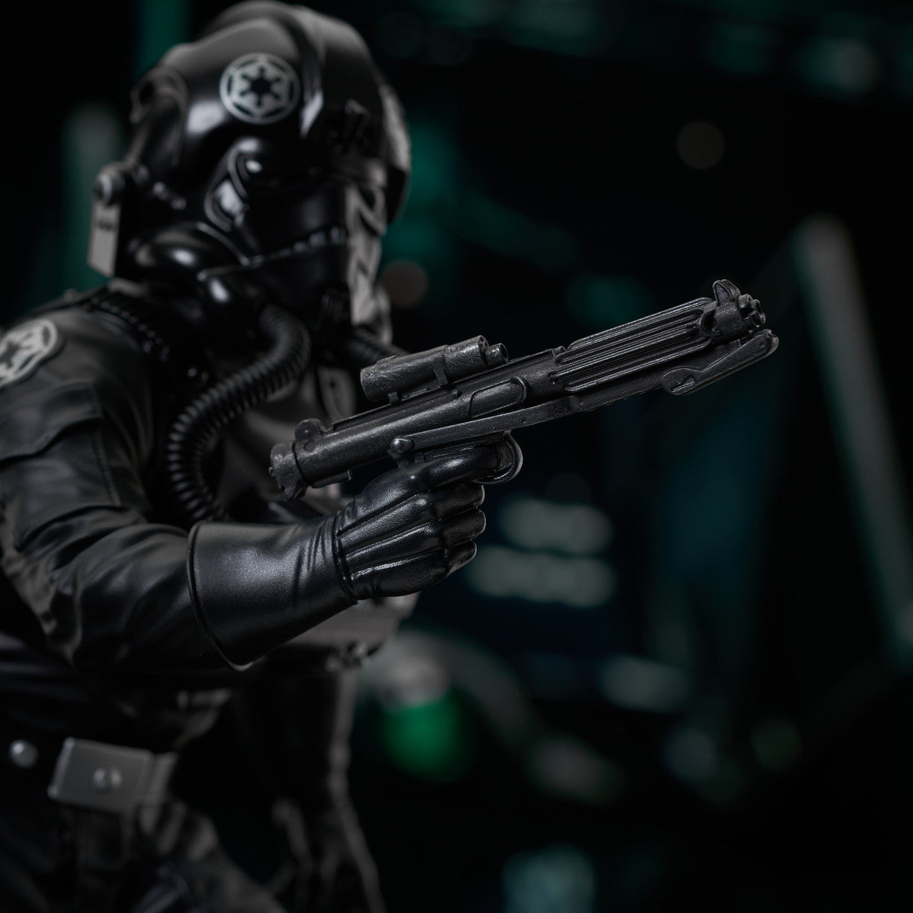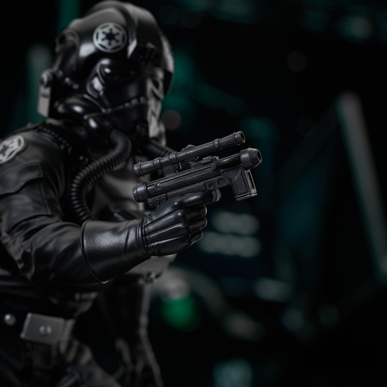 A Gentle Giant LTD release! Move over, stormtroopers - it's the TIE Pilot's time to shine! This 1/6 scale statue of an Imperial TIE Fighter Pilot depicts him dashing to his fighter so he can engage the enemy. Measuring approximately 12 inches tall, he carries a small blaster in case he encounters any resistance along the way -- in fact, he has interchangeable E-11 and SE-14r blaster pistols! Limited to only 1000 pieces and hand-numbered on the base, it comes packaged with a matching certificate of authenticity in a full-color numbered box.
