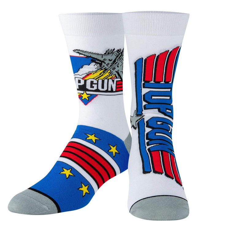 When you feel the need the speed and don't even know what second place is then you are ready to be crowned the Top Gun! These socks are built for both comfort and speed so get yours before they fly by. These white crew socks feature a graphic knitted image of the Top Hun F-14 fighter pilot and the colorful title in red, blue and gold.