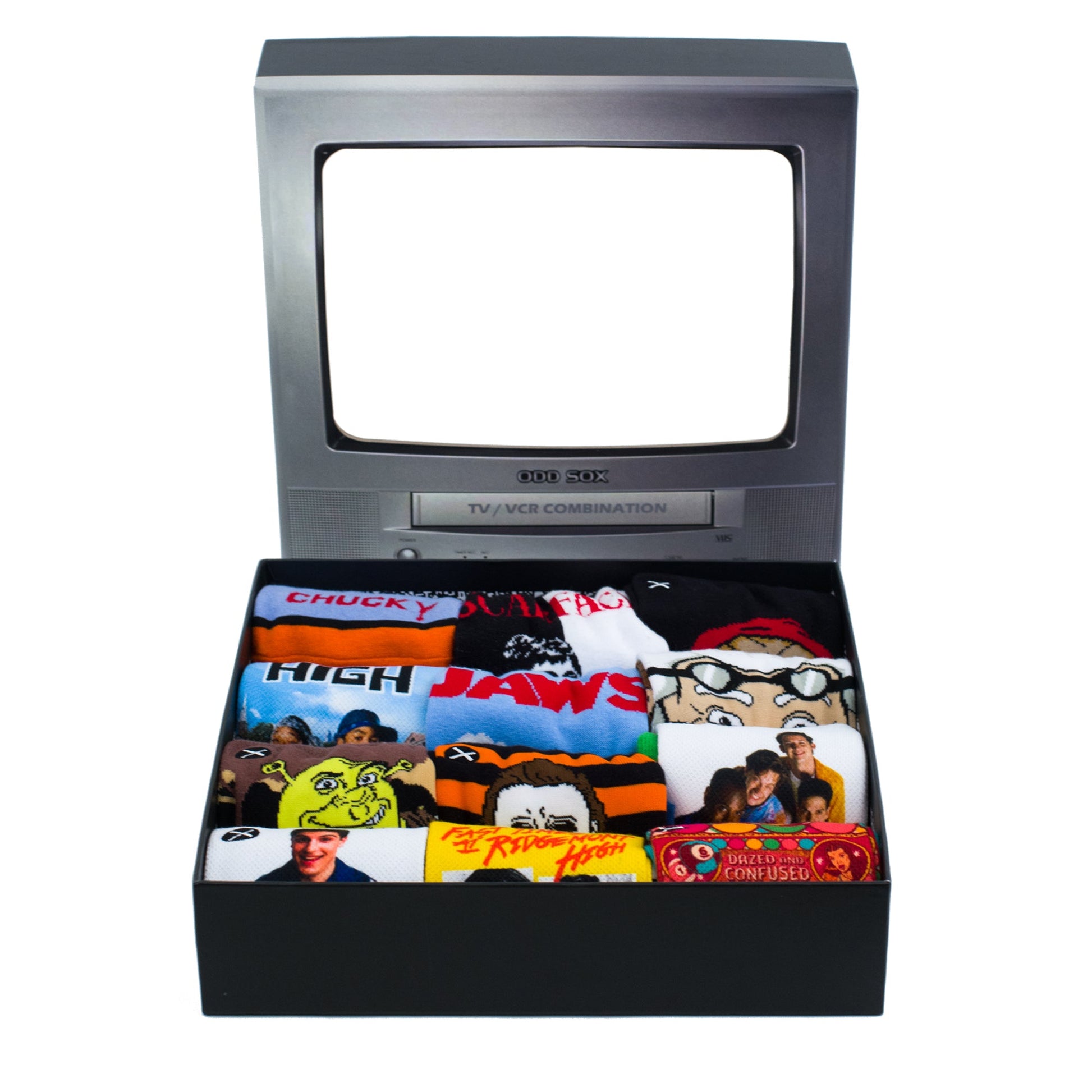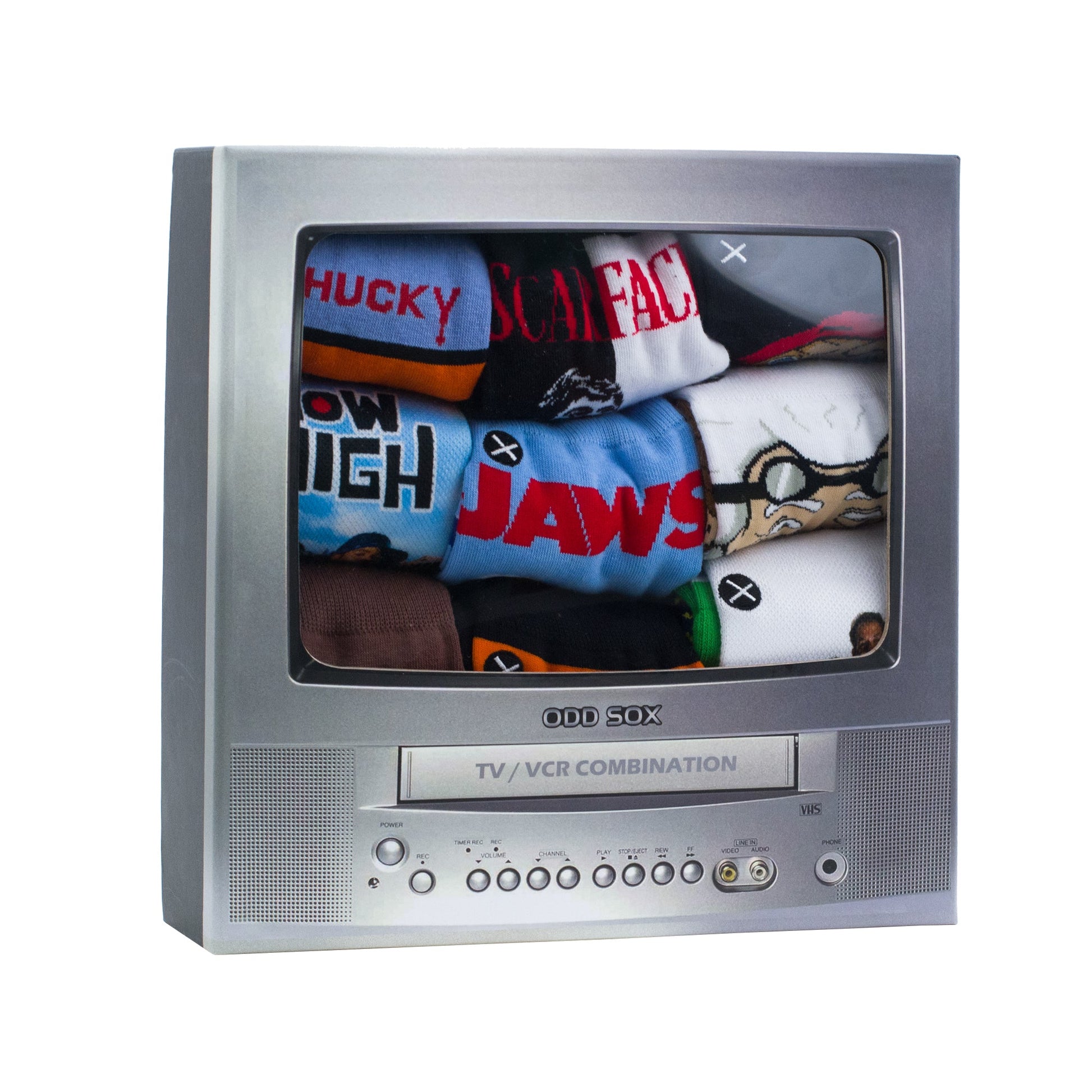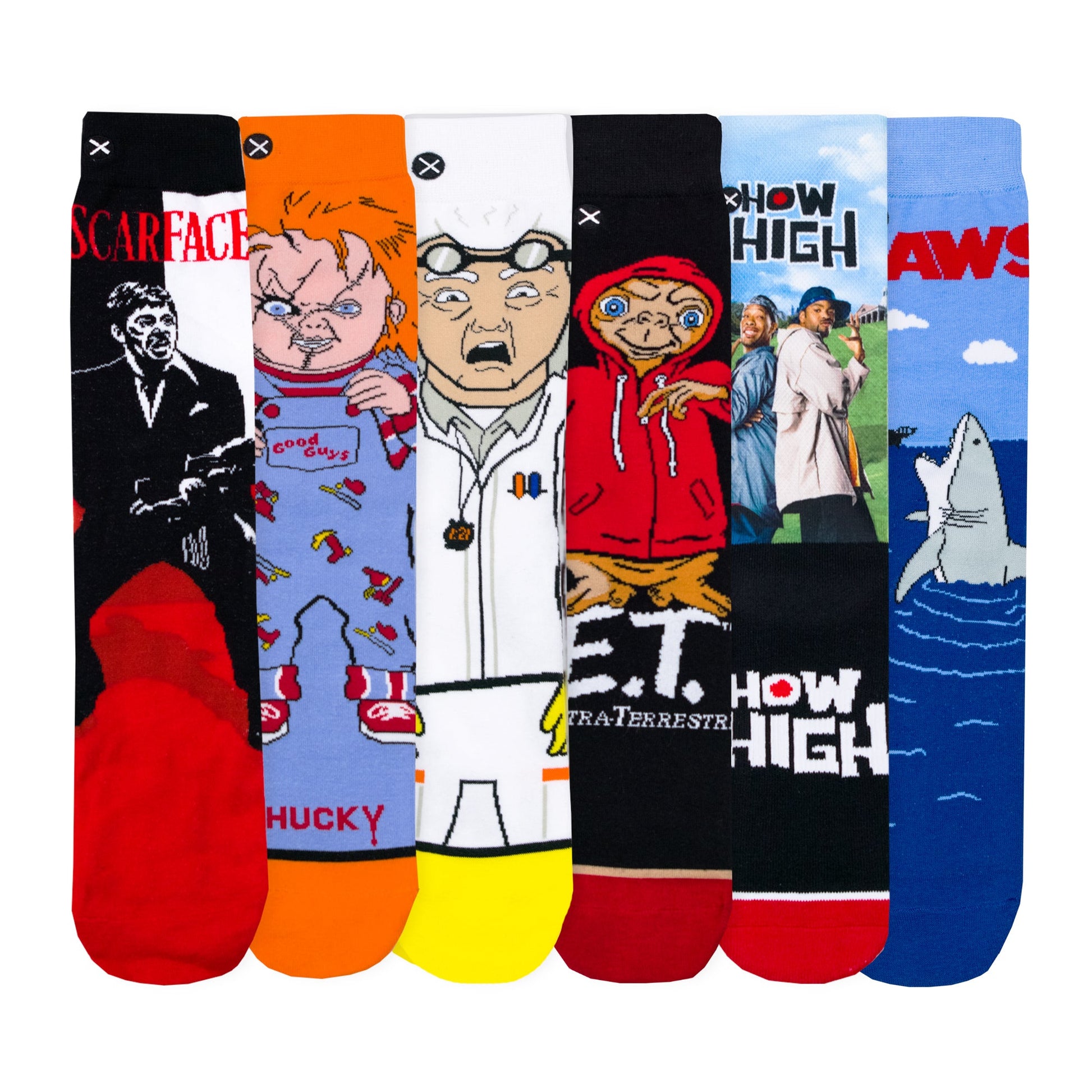 Favorite TV & Movies Sock Gift Set, 12 Pairs. Fun Colorful Socks. Includes Chucky, Scarface, E.T., Back to the Future, Jaws, Halloween Prints. Features: Extended cuff for snug fit Intricate ..