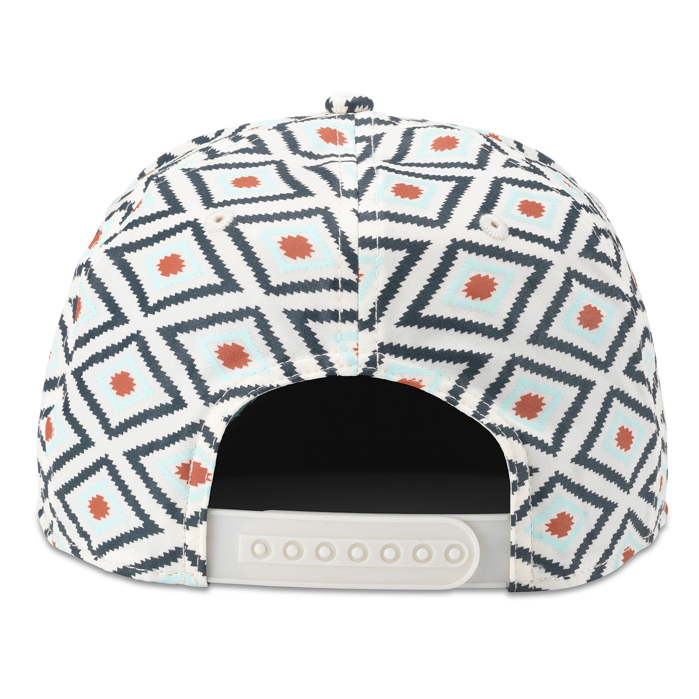 Matte printed pattern on Nylon fabric with 5-panel deep dish structured crown. Flat brim visor and adjustable plastic snap back strap. Paracord rope across visor and logo is woven label merrowed patch.